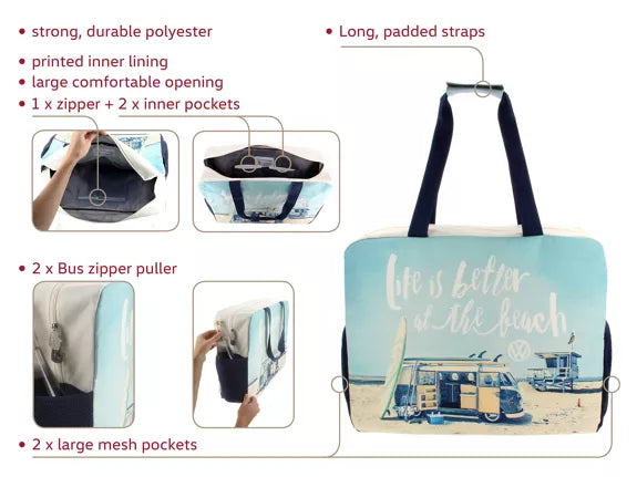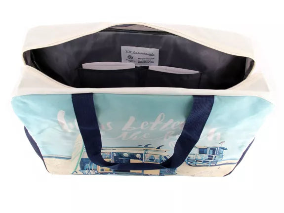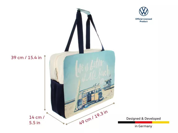Le Shopper VW Combi de haute qualité est fabriqué en polyester robuste D600, avec une doublure intérieure en nylon imprimée. Le sac Volkswagen Beach/Shopper supporte une charge élevée et peut être chargé jusqu'à 30 KG. Le sac est également imperméable et lavable à la main.